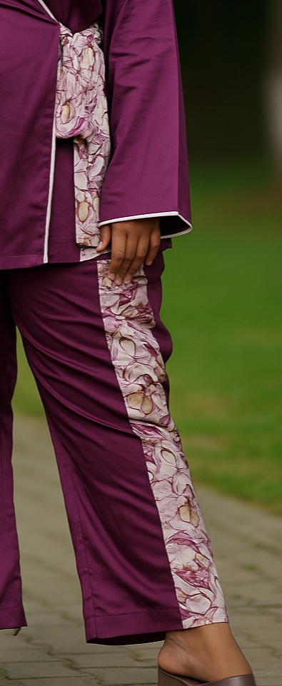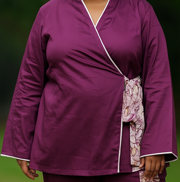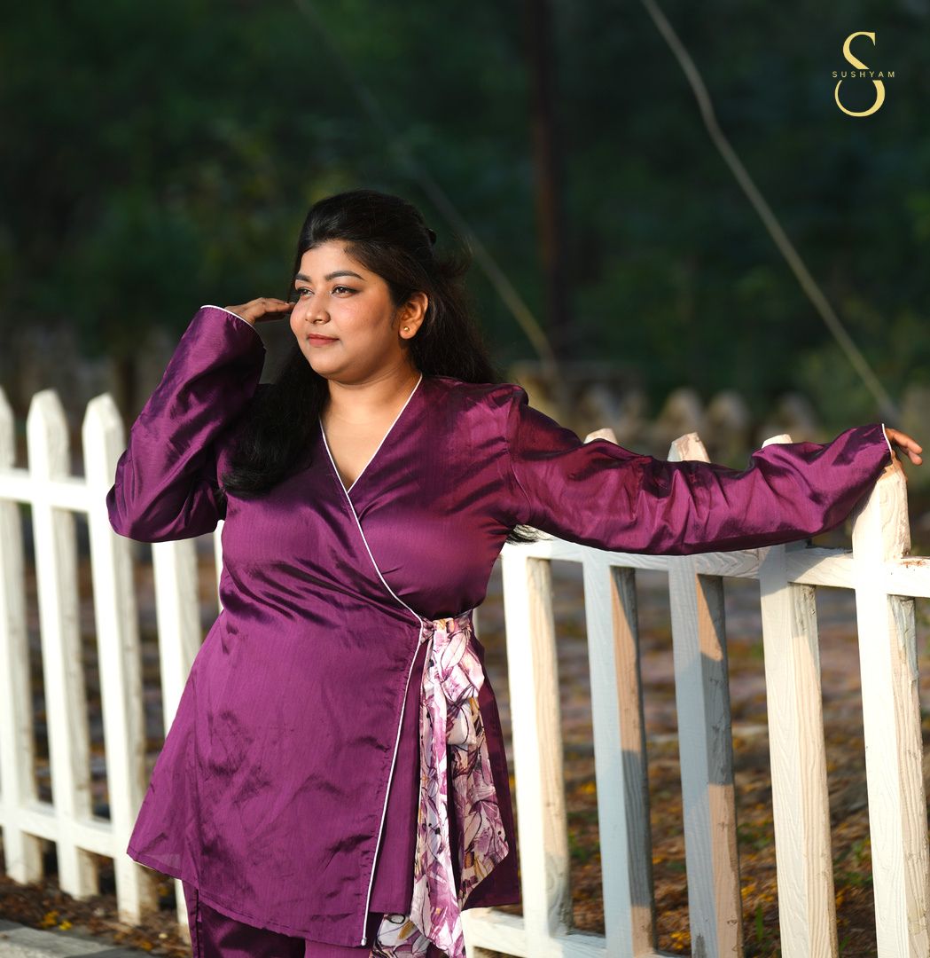 Top Fabric: Tapeta Silk Bottom Fabric: Tapeta Silk Top Color: Purple Bottom Color: Purple Sleeve Length: Full Sleeves Neckline: V-Neck Wrap Style Length: Ankle LengthTop Design: Solid with Floral Inner Tie-Up Belt Bottom Type: Straight Pants Fit/Shape: Relaxed Fit – Ideal for Plus Size Occasion: Festive, Brunch, or Casual Party Wear Net Quantity (N): 1 Set (Kurta + Bottom)