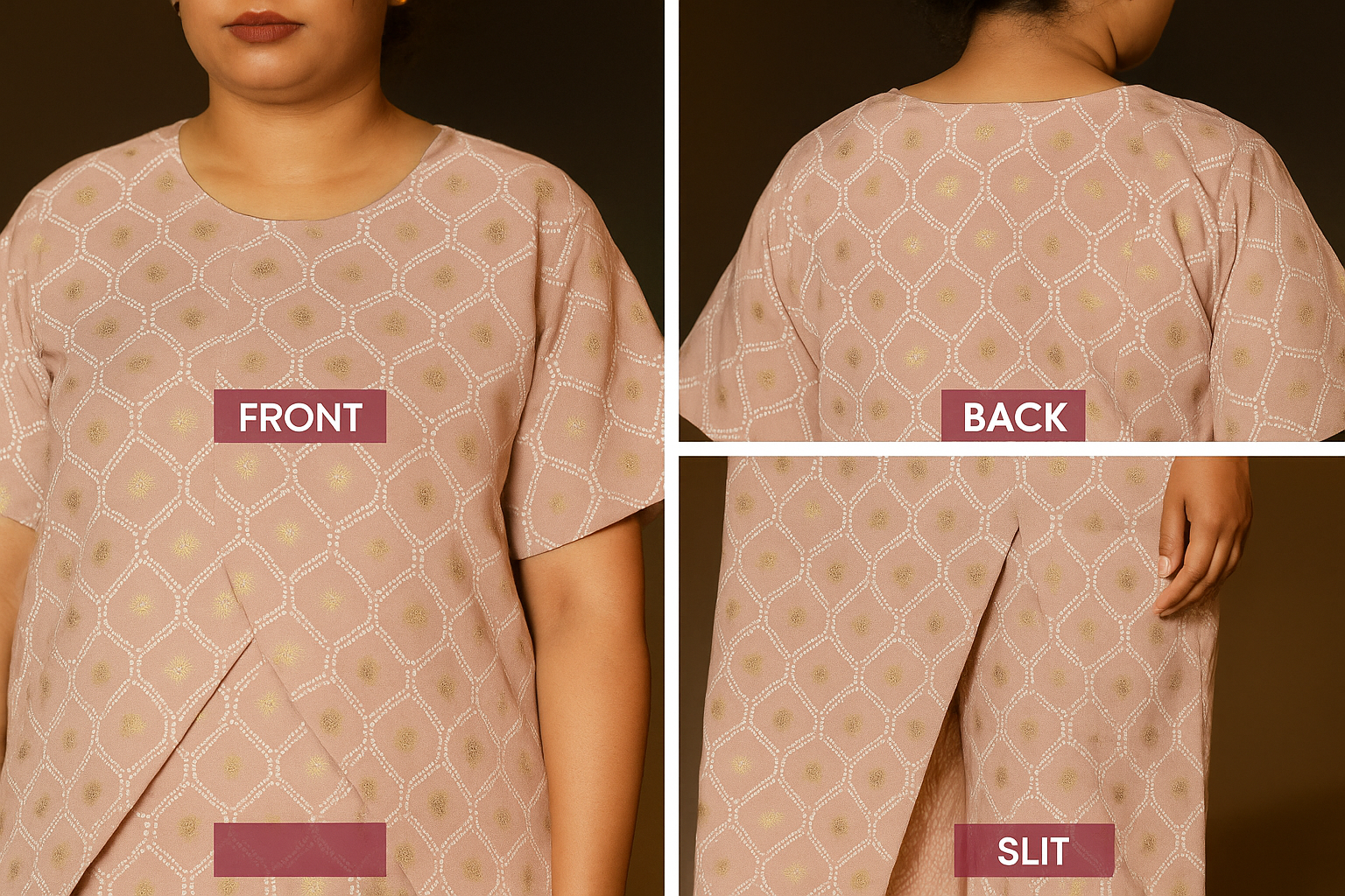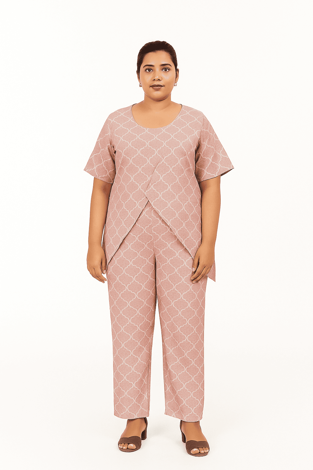 The Mauve Maze Coord Set is a two-piece plus-size friendly outfit crafted in premium cotton, featuring a soft mauve pink base with subtle geometric print and delicate gold foil detailing all over. Designed with a round neckline, half sleeves, and a stylish front slit-cut overlap top, this set blends comfort with understated elegance. Paired with straight pants for easy movement, it's perfect for brunches, light festive occasions, or casual gatherings. Available in sizes L to XXXL, the top comes in lengths ranging from 32 to 36 inches with bust sizes from 40 to 46 inches, and bottom lengths from 38 to 40 inches. Made in India, this relaxed-fit coord set is ideal for women who want breathable style with a hint of shimmer.